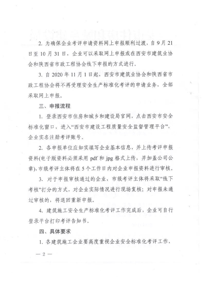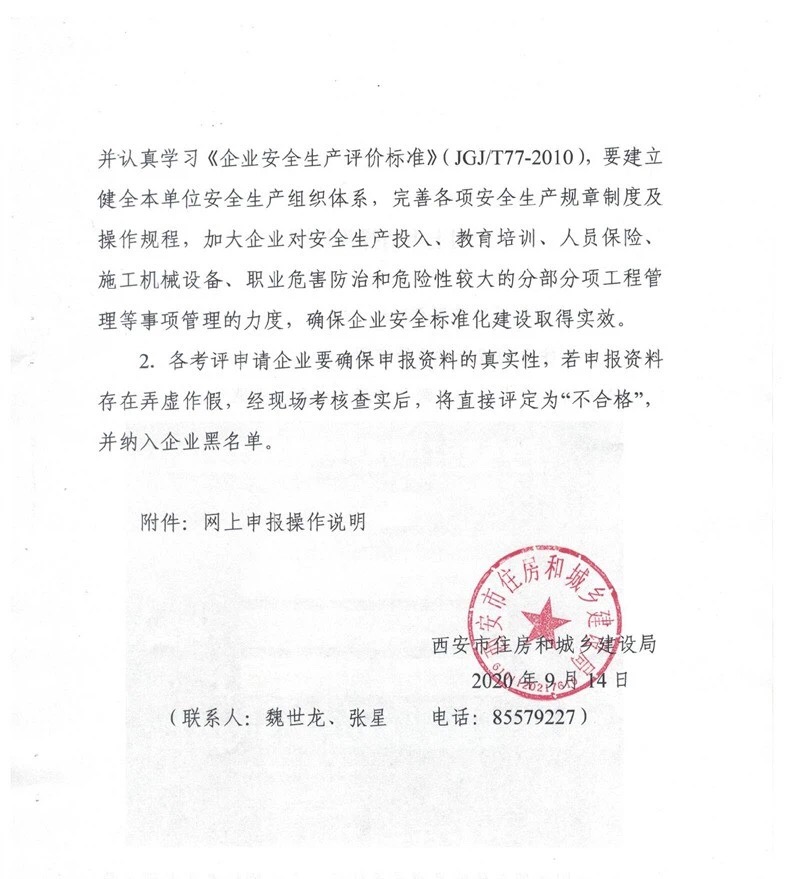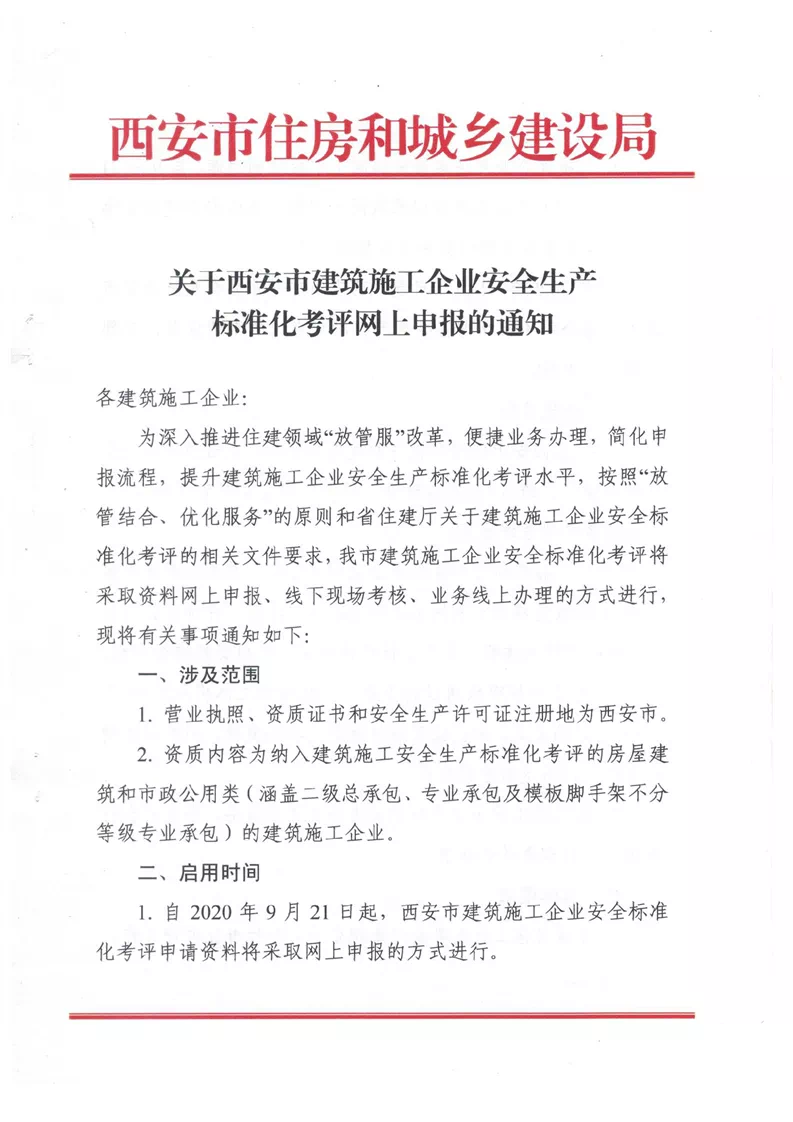“ 9月15日,西安市住房和城鄉(xiāng)建設局發(fā)布關于西安市建筑施工企業(yè)安全生產(chǎn)標準化考評網(wǎng)上申報的通知。”